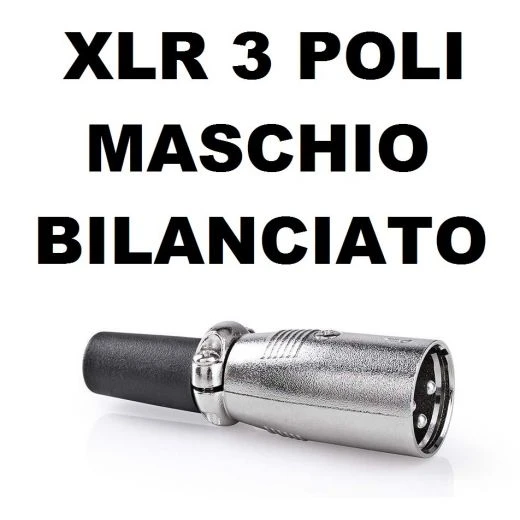 Connettore XLR maschio a 3 poli. Corpo in metallo nero e contatti argentati.